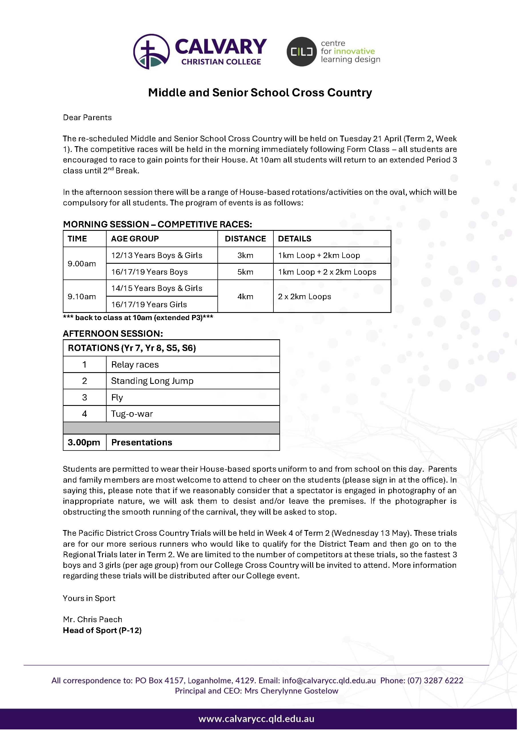 The Junior School and Middle Senior School Cross Country events have been rescheduled to Tuesday 21 April (second day back of Term 2).