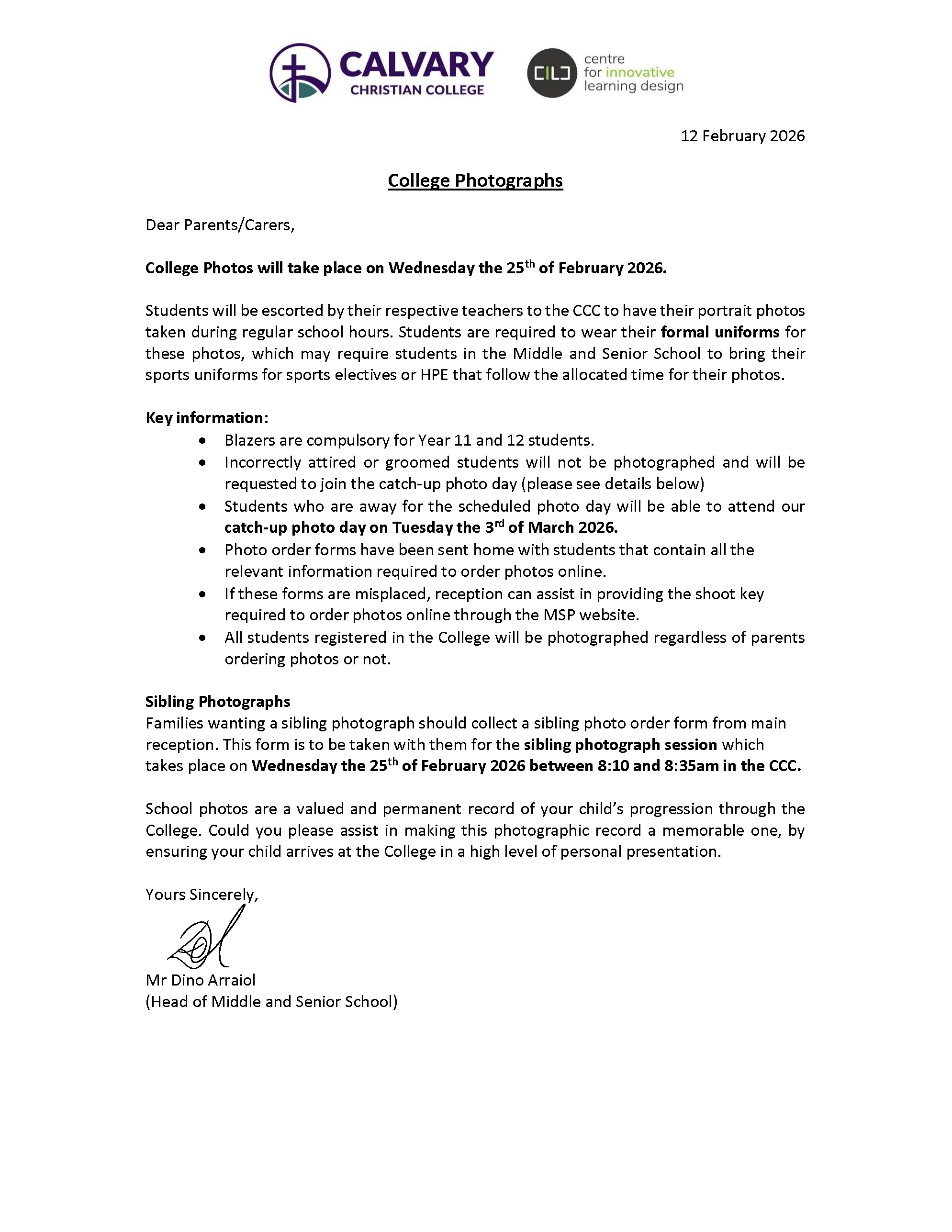 The annual College Portrait Photo Day is taking place on Wednesday 25 February 2026. The below document outlines important information related to this event for all parents and carers.